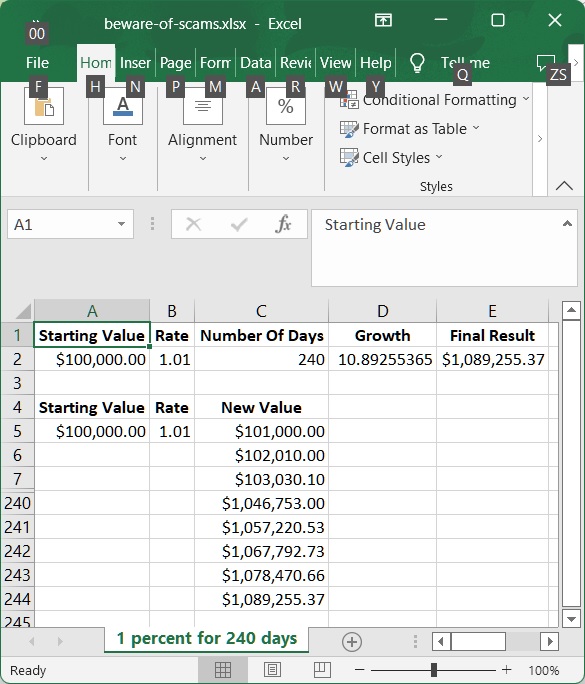 The spreadsheet will walk you through how growing your principal by 1% day one, then taking the new value and growing it 1% each day would grow to more than 10 times the initial value in 240 days.